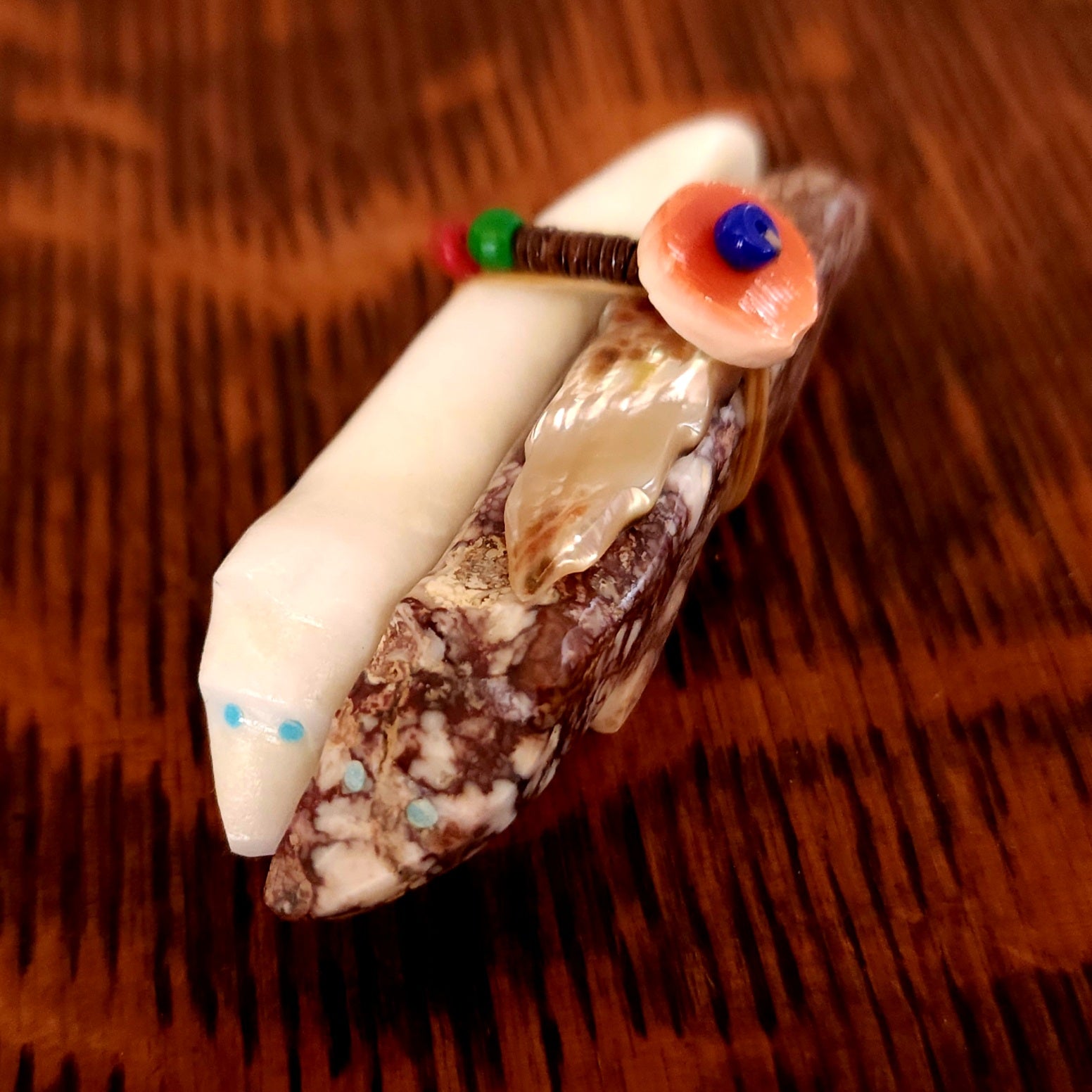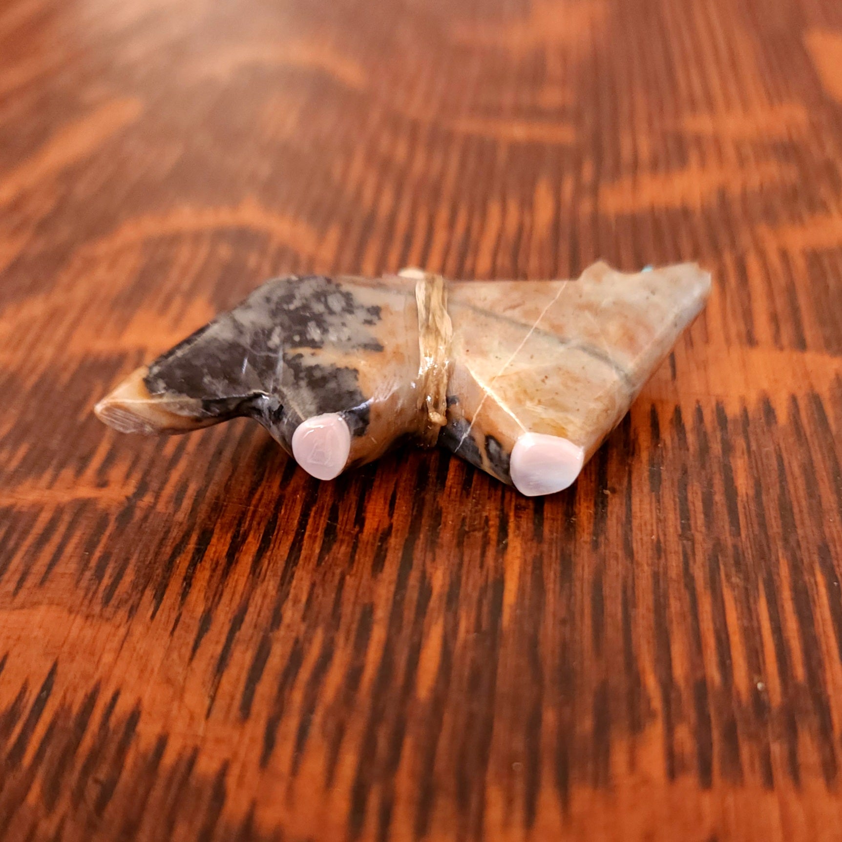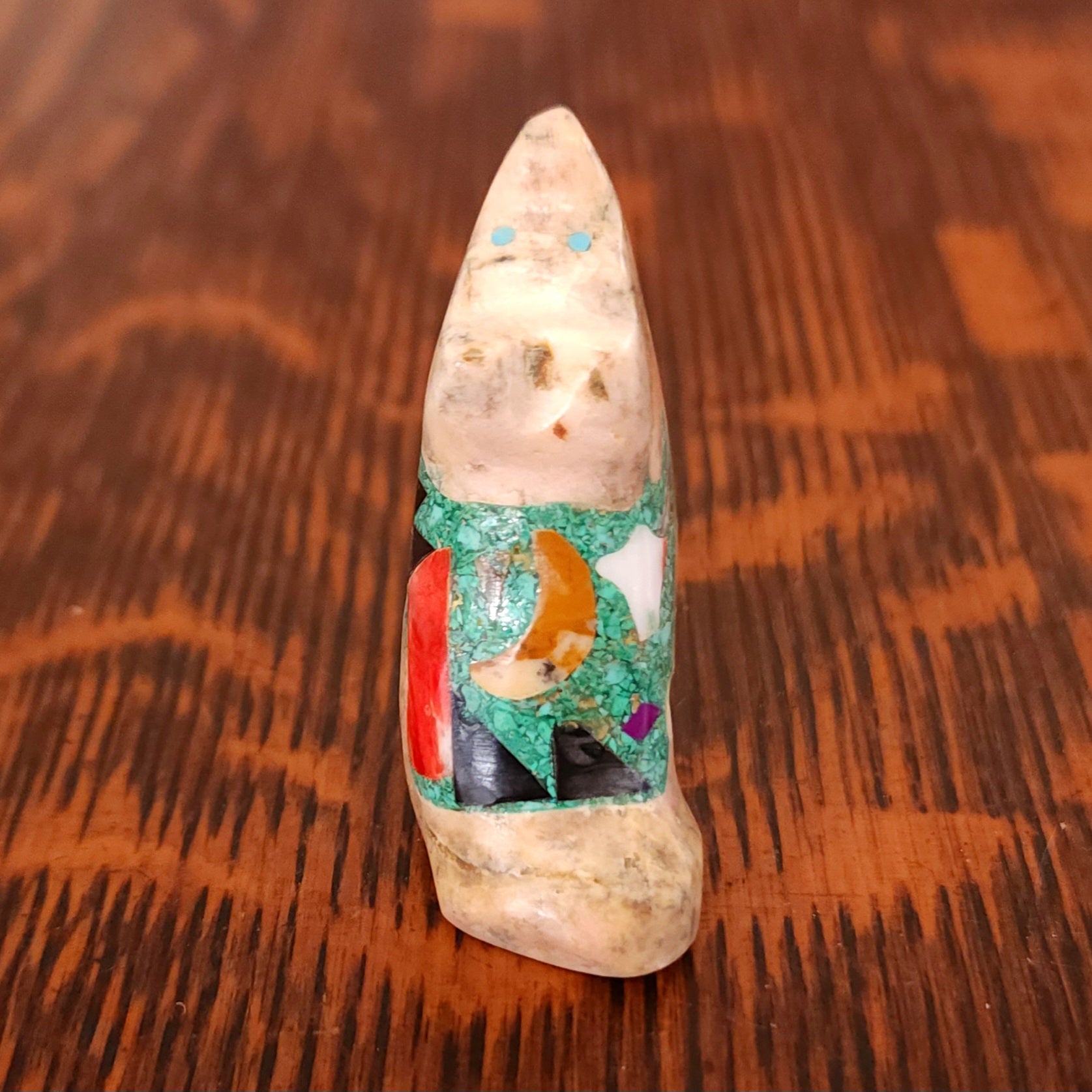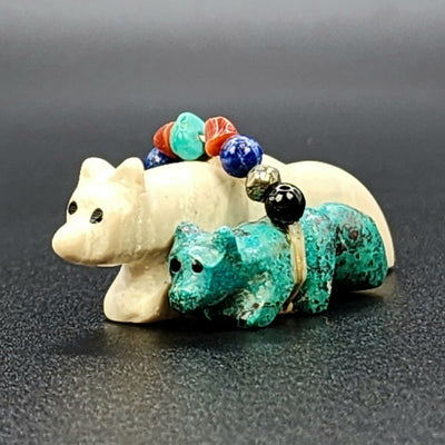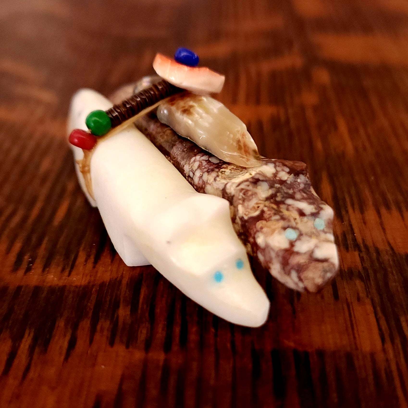 Traditionally, Zuni carvings are symbolically fed cornmeal. Each Zuni fetish comes in a box with a descriptive card and a tiny bit of corn meal to tide them over until they reach you.