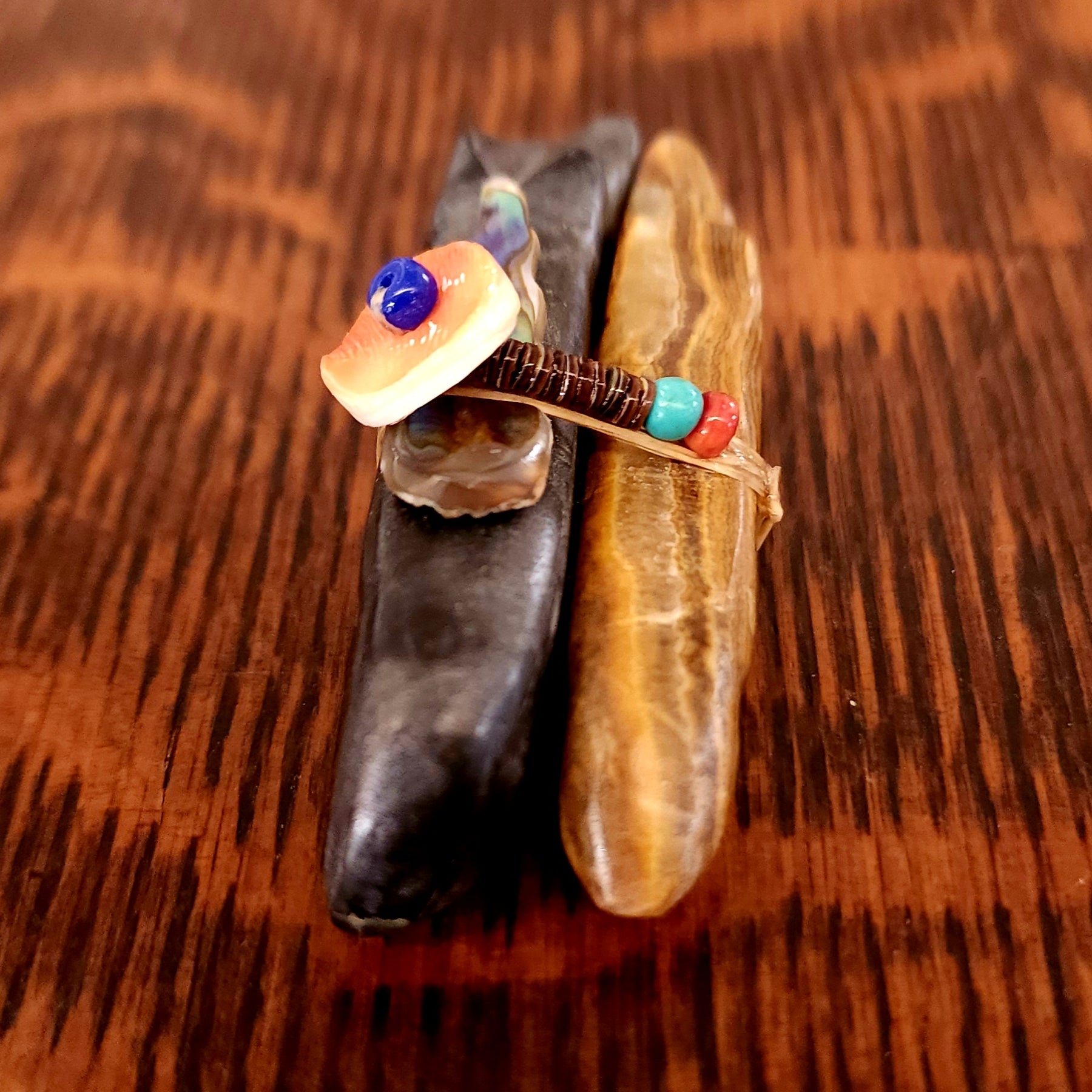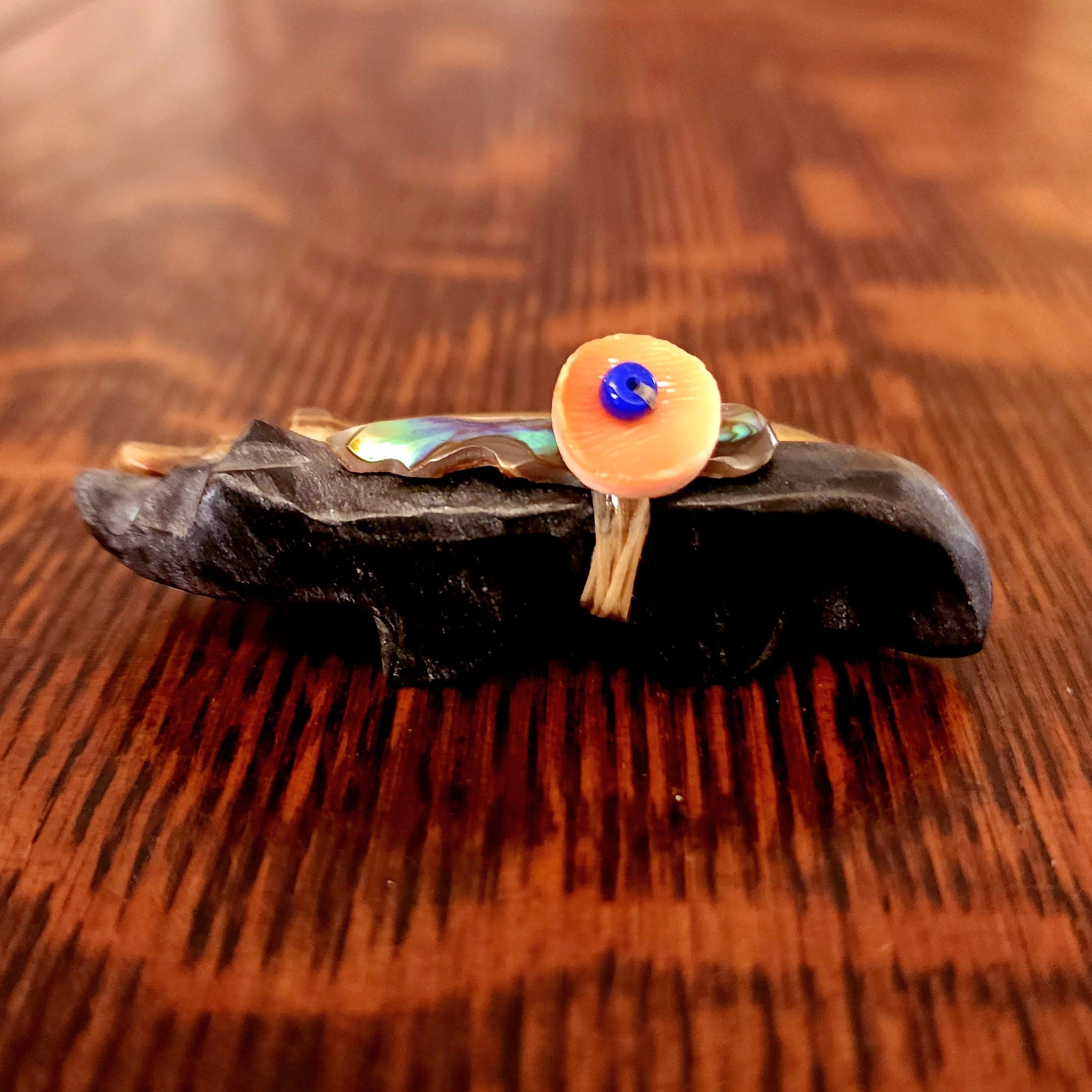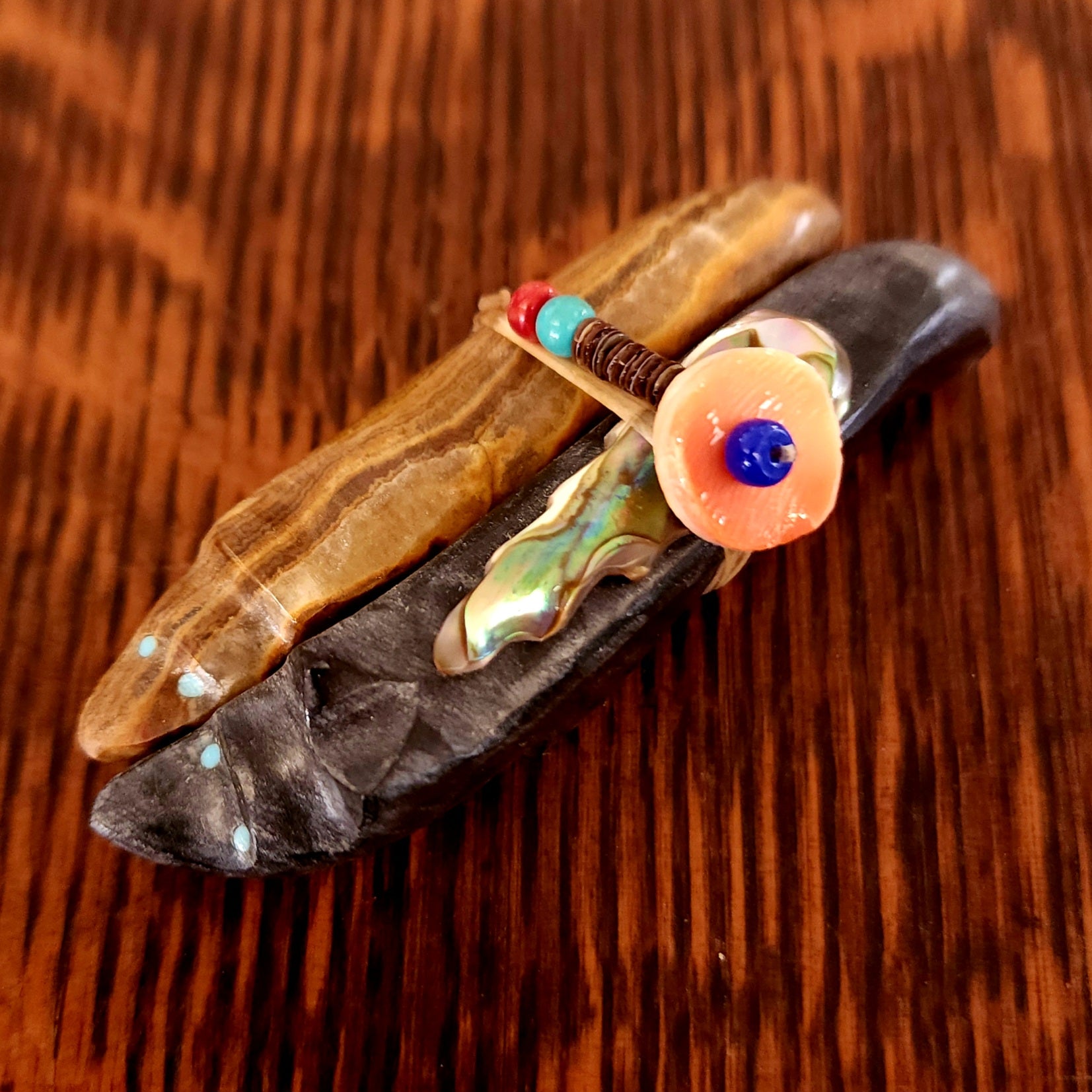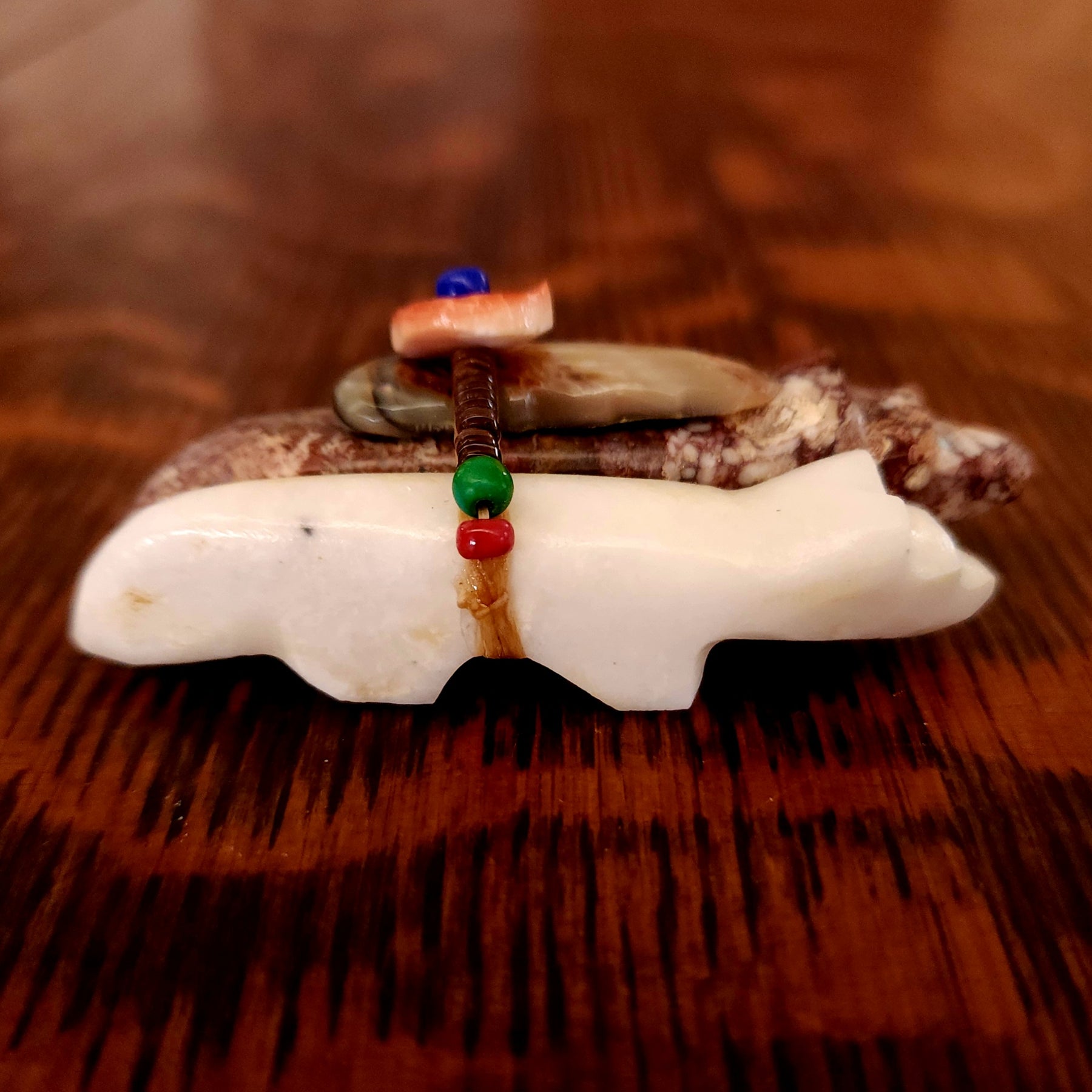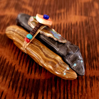 Traditionally, Zuni carvings are symbolically fed cornmeal. Each Zuni fetish comes in a box with a descriptive card and a tiny bit of corn meal to tide them over until they reach you.