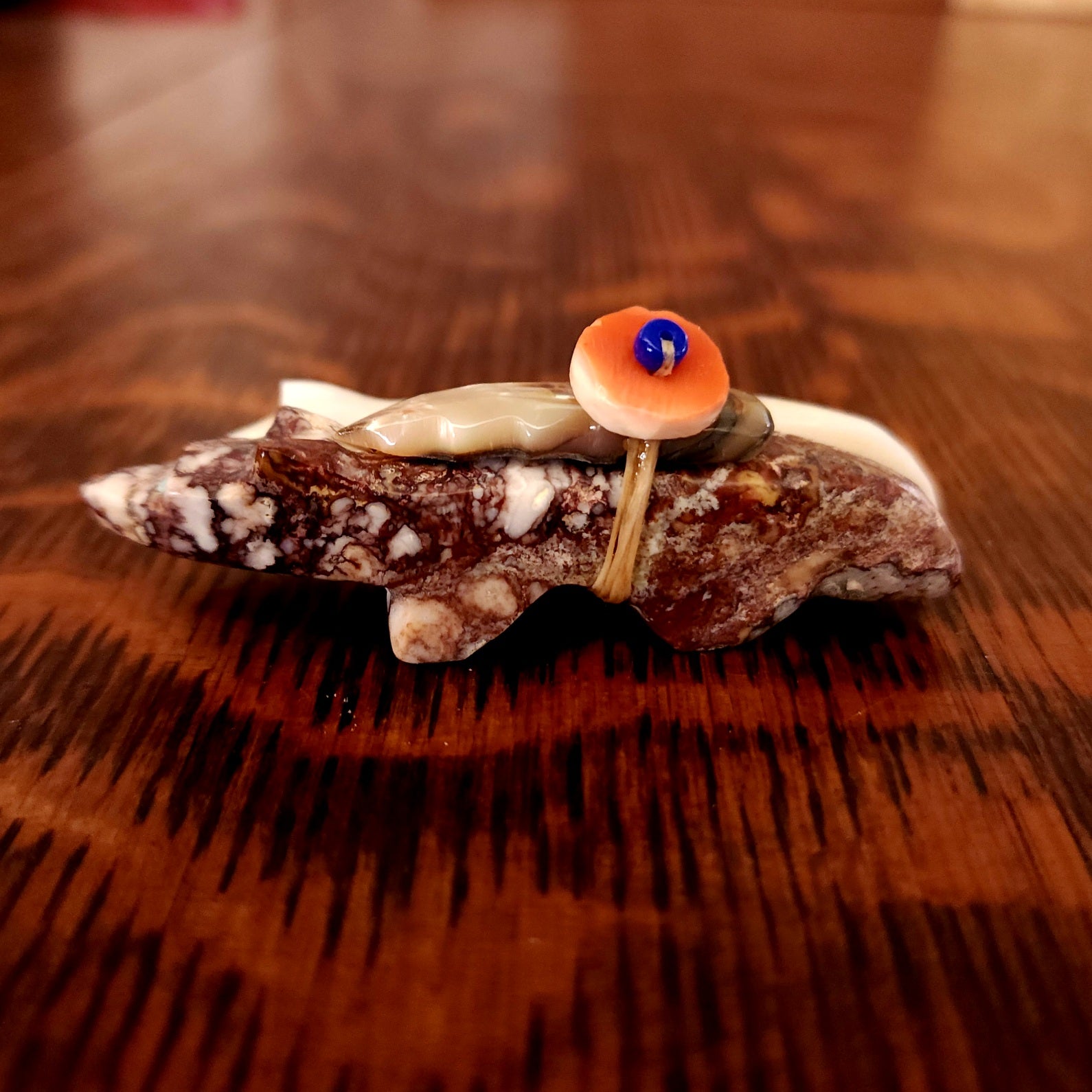 This highly polished Star Gazing Bushytail was carved by Delvin Leekya from Picasso marble. It is gazing up from turquoise eyes...making seeing a meteor shower? It has inlaid pink mussel shell feet and a bundle of a pink mussel shell arrowhead and smaller turquoise on top. More about bushytails below.