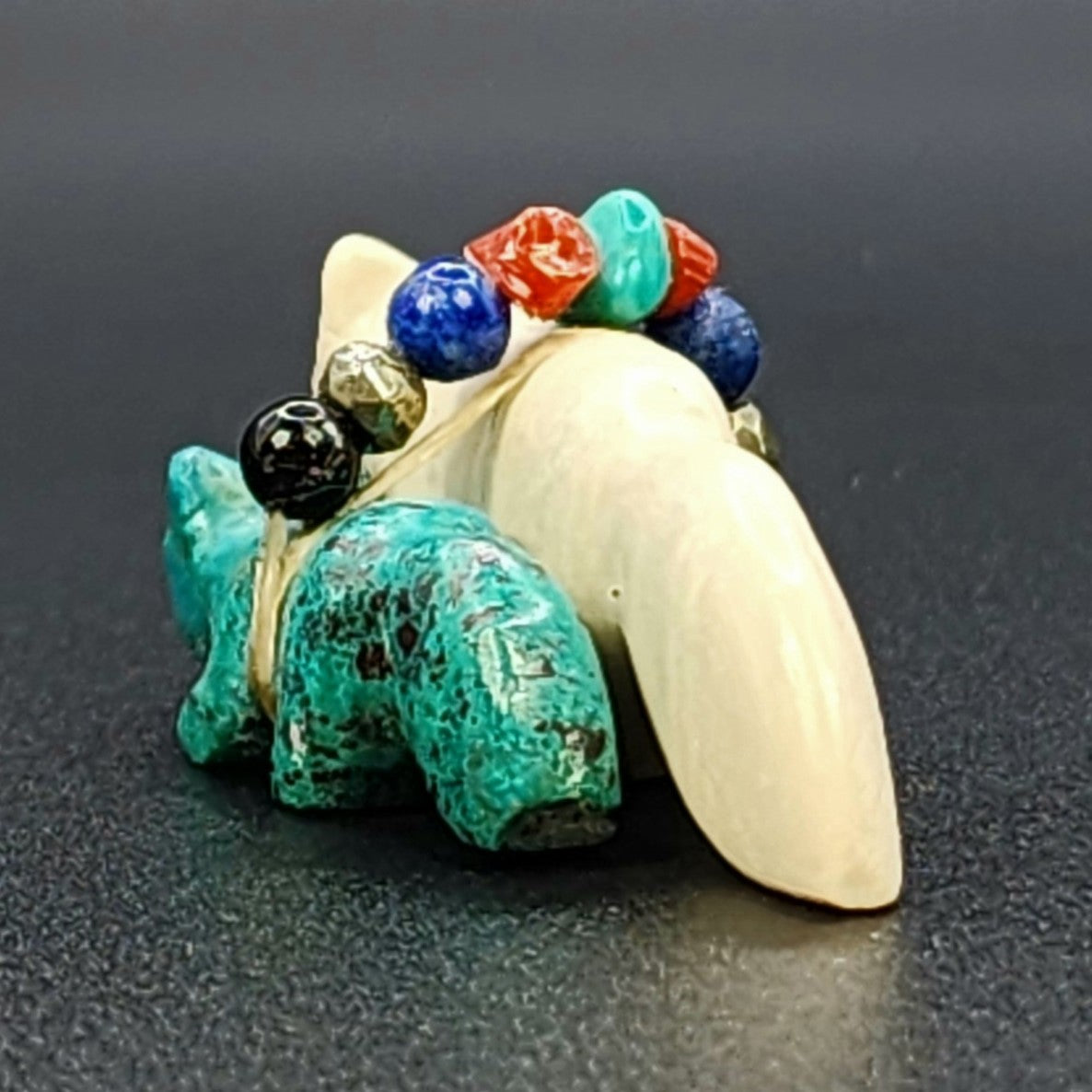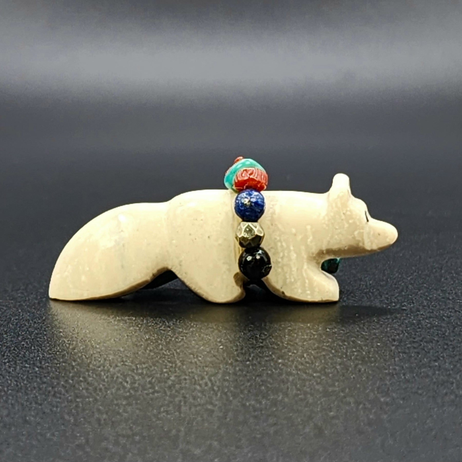 Traditionally, Zuni carvings are symbolically fed cornmeal. Each Zuni fetish comes in a box with a descriptive card and a tiny bit of corn meal to tide them over until they reach you.