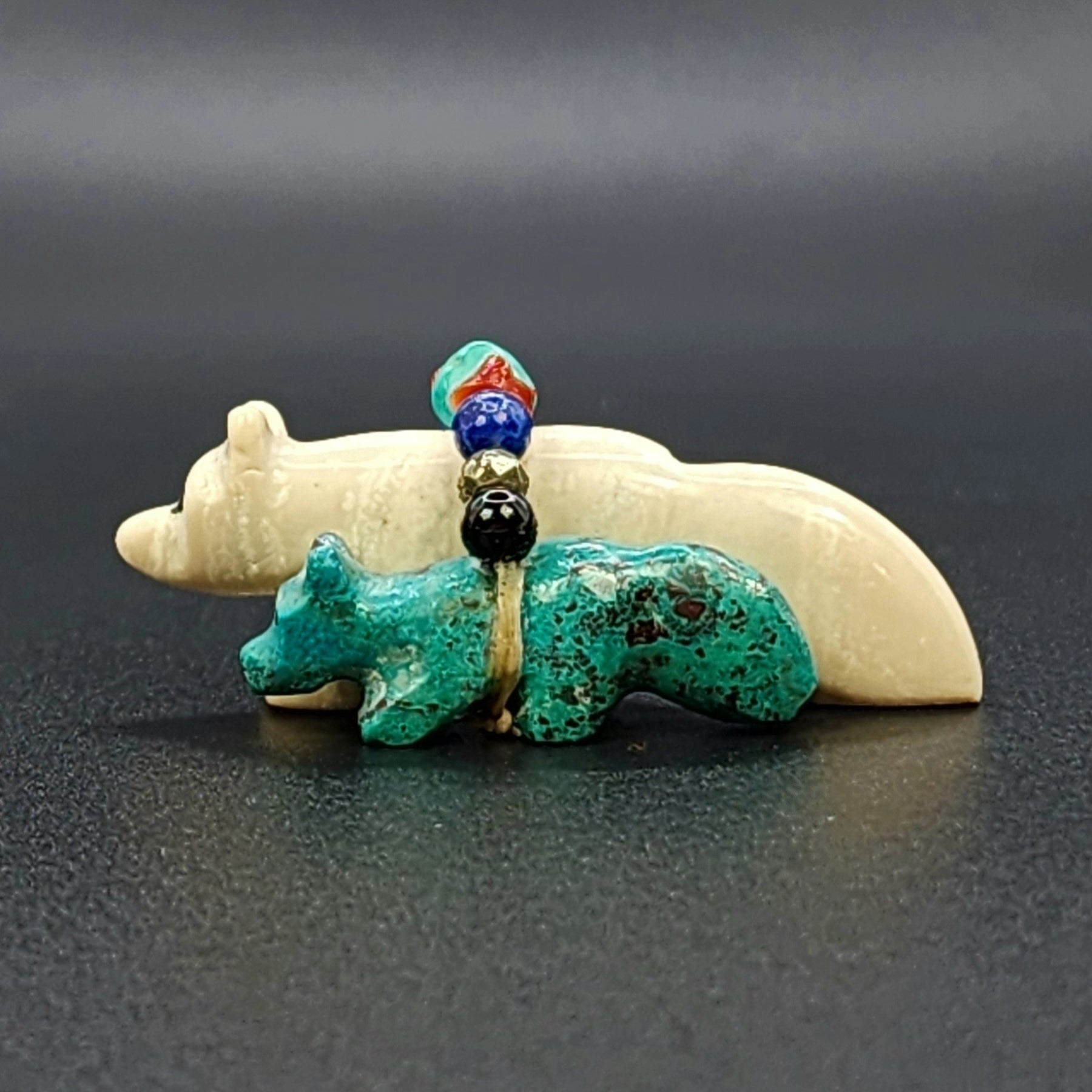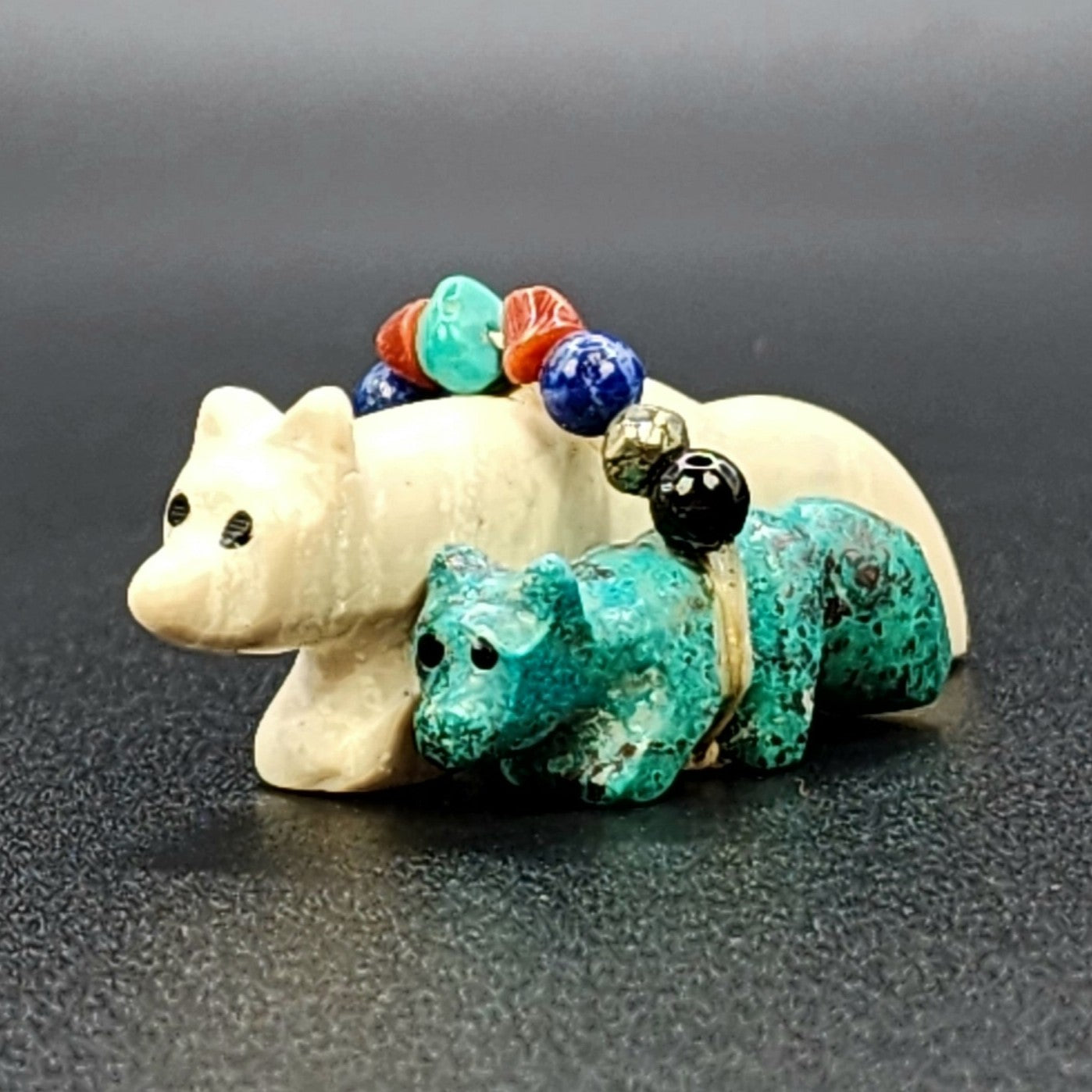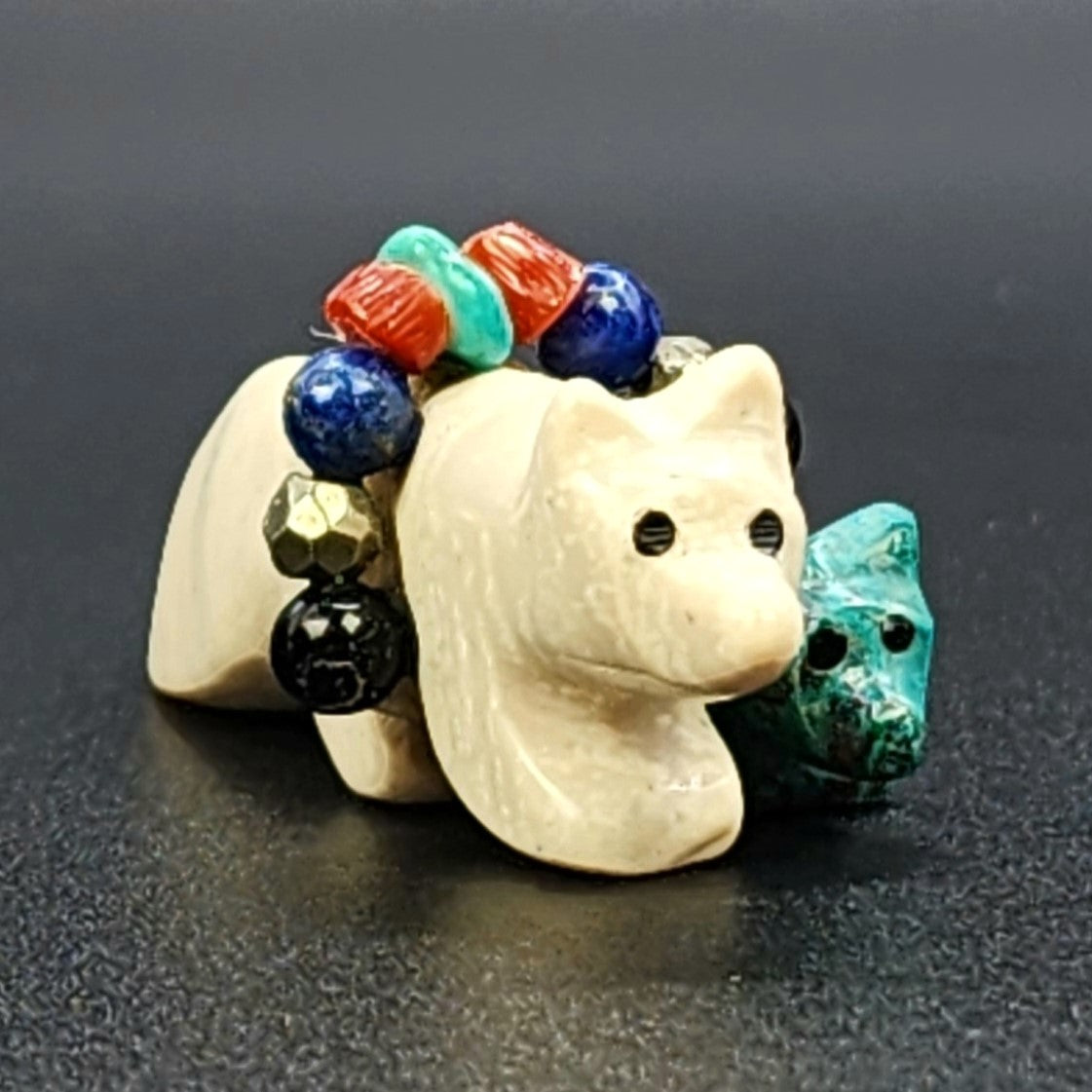 Regular price $110.00 Save $-110.00Parent and child? Friends? Lovers? Whatever the relationship, they are bound together with love and mutual respect. The larger wolf is carved from cream colored serpentine, and the smaller wolf is carved from chrysocolla. They have inlaid jet eyes. The offering bundle includes lapis, onyx, pyrite, coral, and turquoise. Carved by Cheryl Beyuka from Zuni Pueblo.