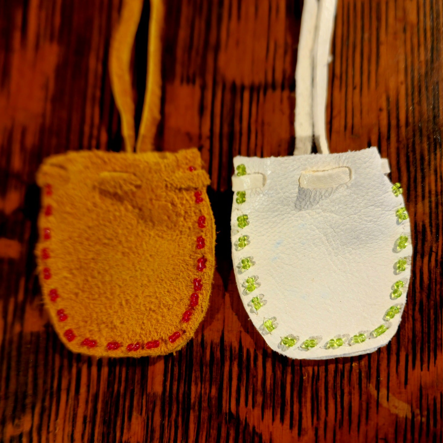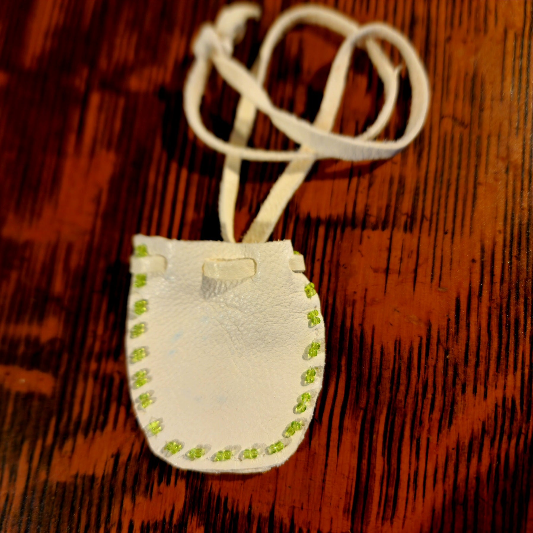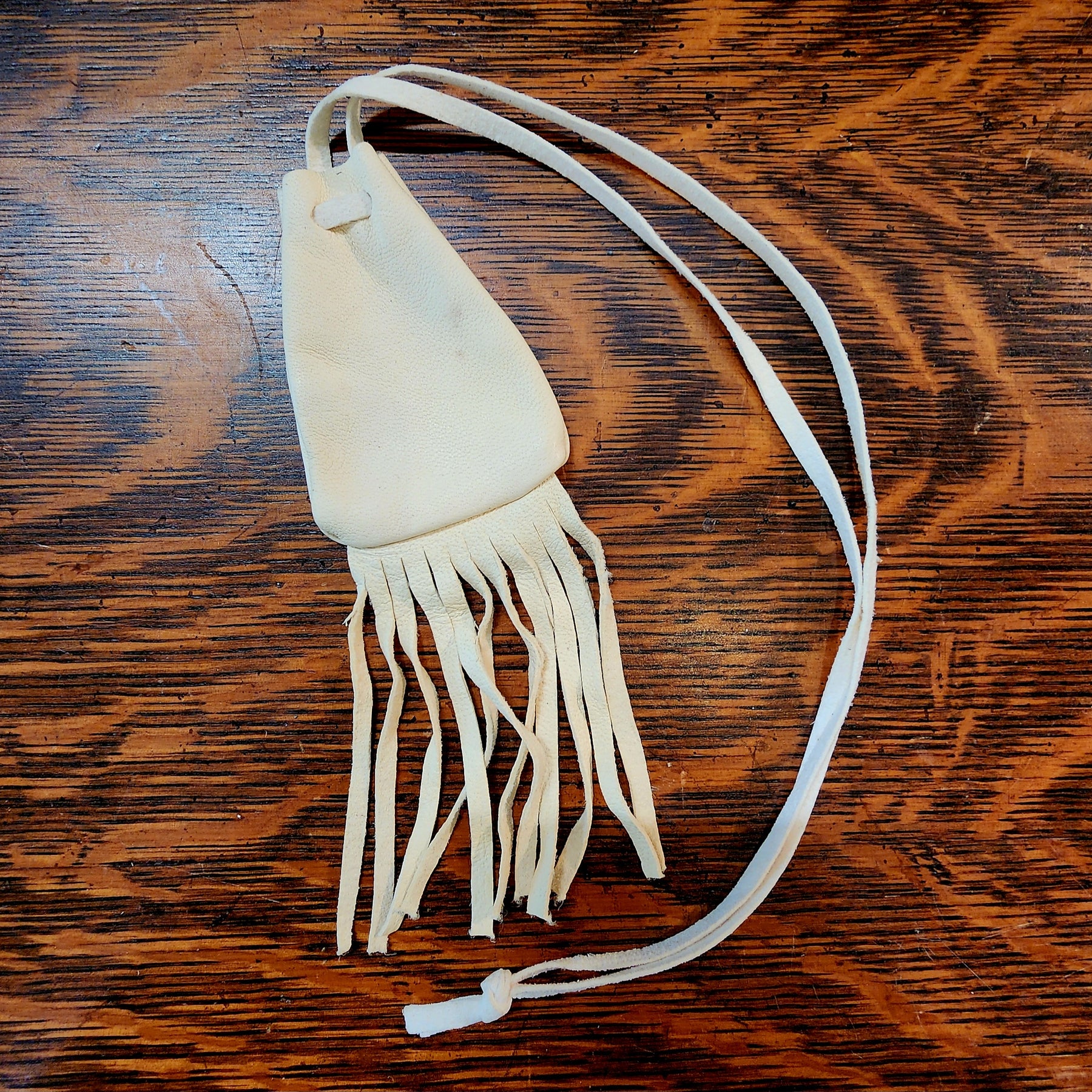 A tiny fetish carving, a bit of tobacco, cedar or sage will fit in this small pouch made from white leather. It opens and closes with a strand of white leather. The long leather strap can be used to wear it, tie it to something else, or make it much shorter.