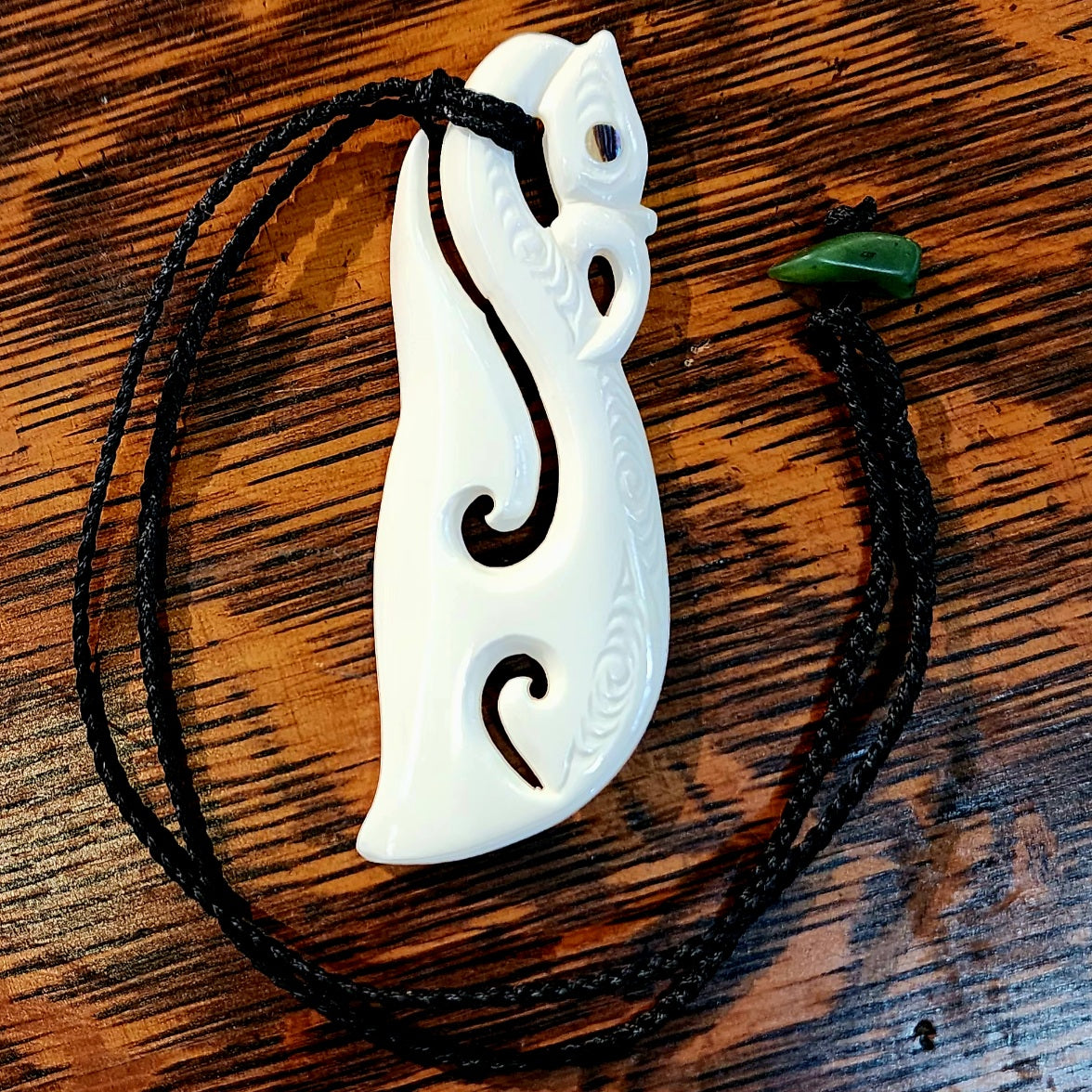 Maori handmade Manaia is an intelligent force of nature in the Maori culture. This Manaia was carved from cow bone and has paua shell eyes. It is strung on hand woven wax cord with a clasp is a green jade bead and round enclosure. More about Manaia below.