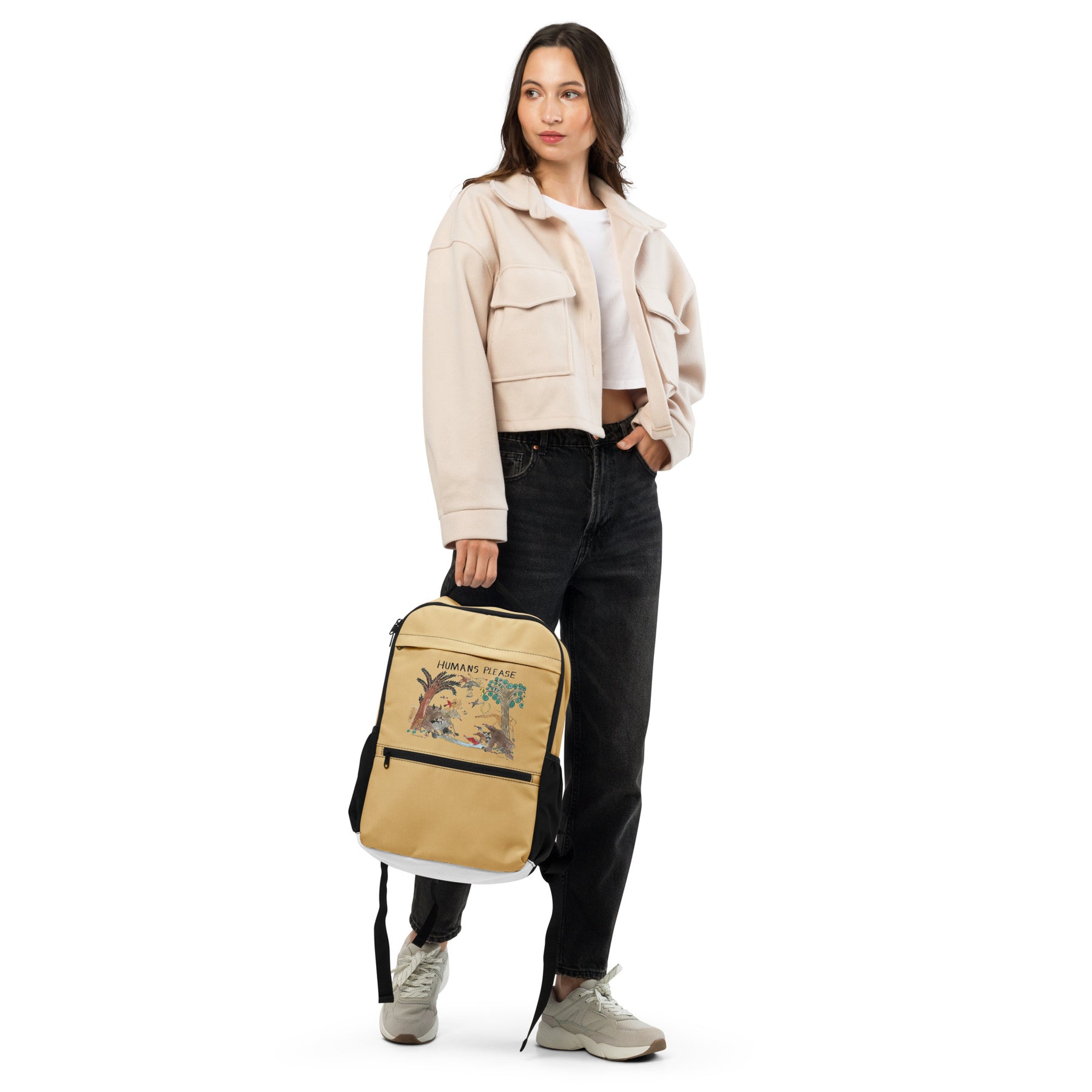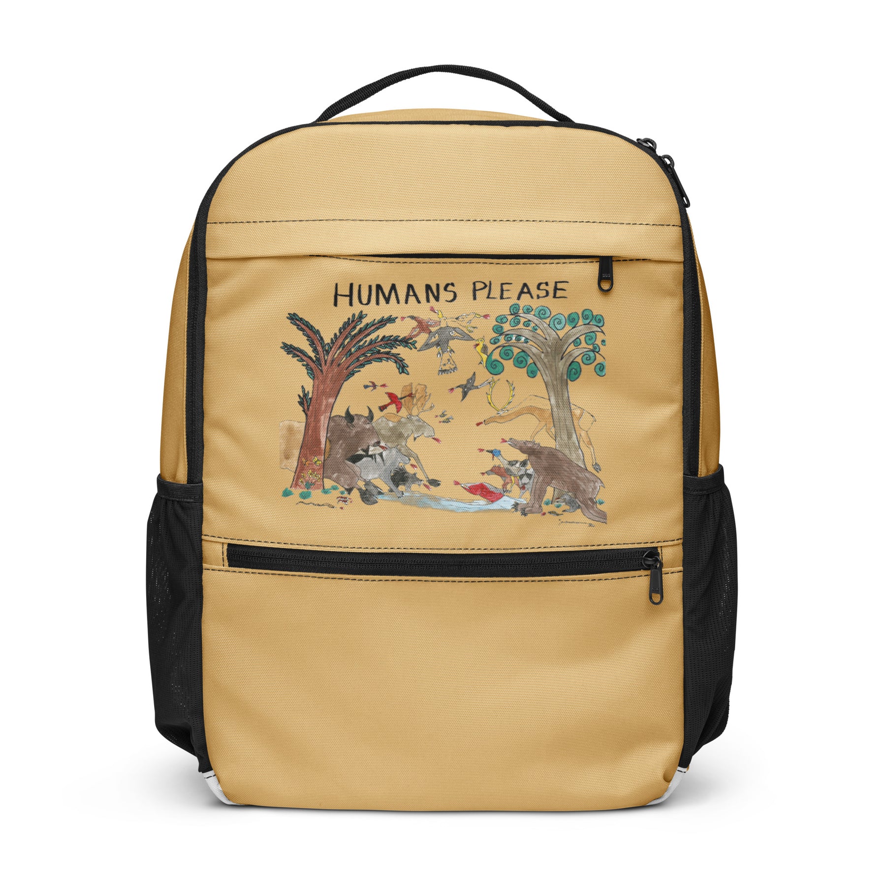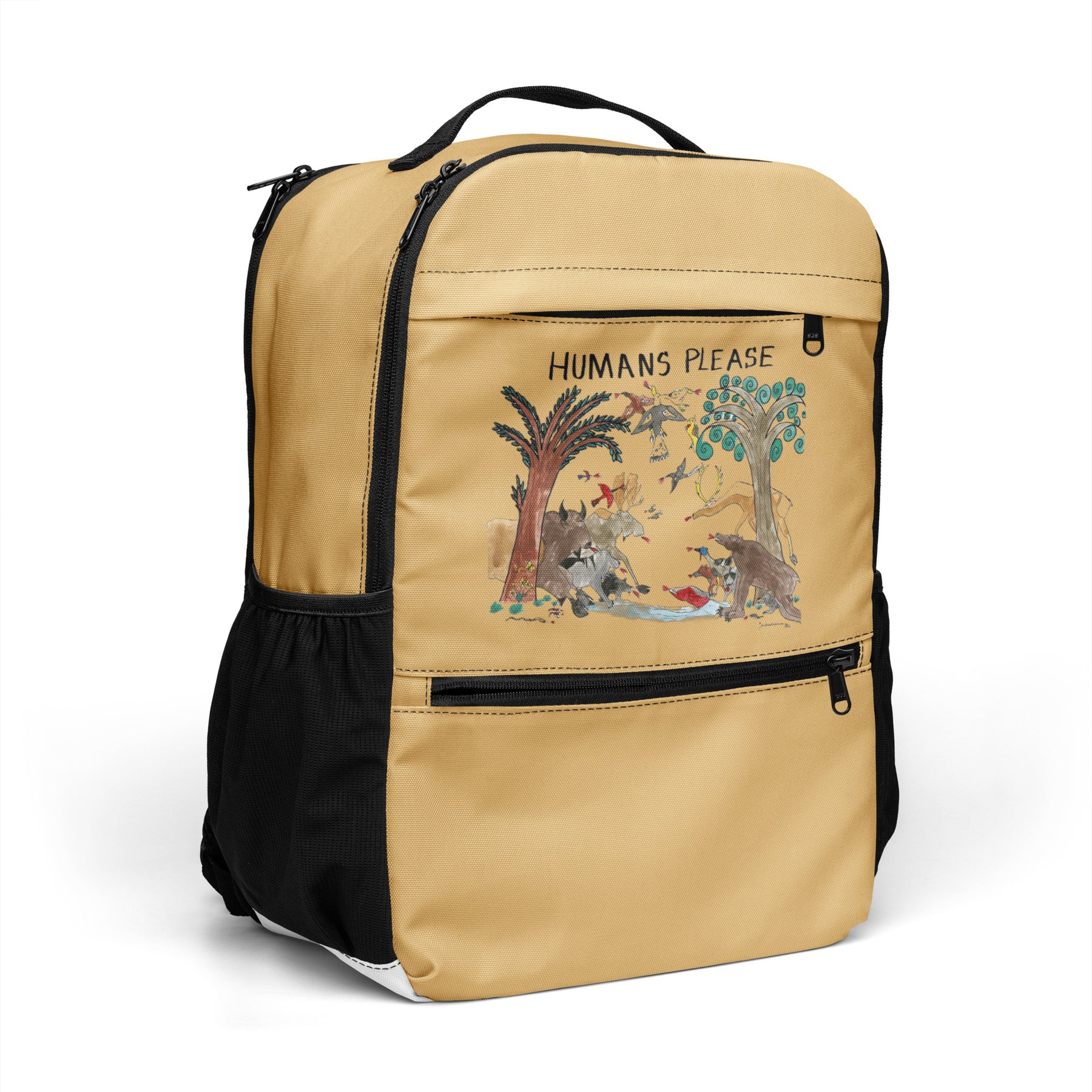 Regular price $96.00 Save $-96.00Humans Please was created by award-winning Yaqui artist, jeweler, and actor to remind us that humans are related to all life and what we do to Mother Earth also impacts our non-human relatives such as buffalo, bear, moose, eagle, owl, salmon, turkey, eagle, hawk, porcupine, racoon, cardinal, and more in this image. This backpack has lots of pockets and is 16" H x