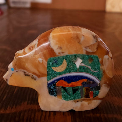 Traditionally, Zuni carvings are symbolically fed cornmeal. Each Zuni fetish comes in a box with a descriptive card and a tiny bit of corn meal to tide them over until they reach you.