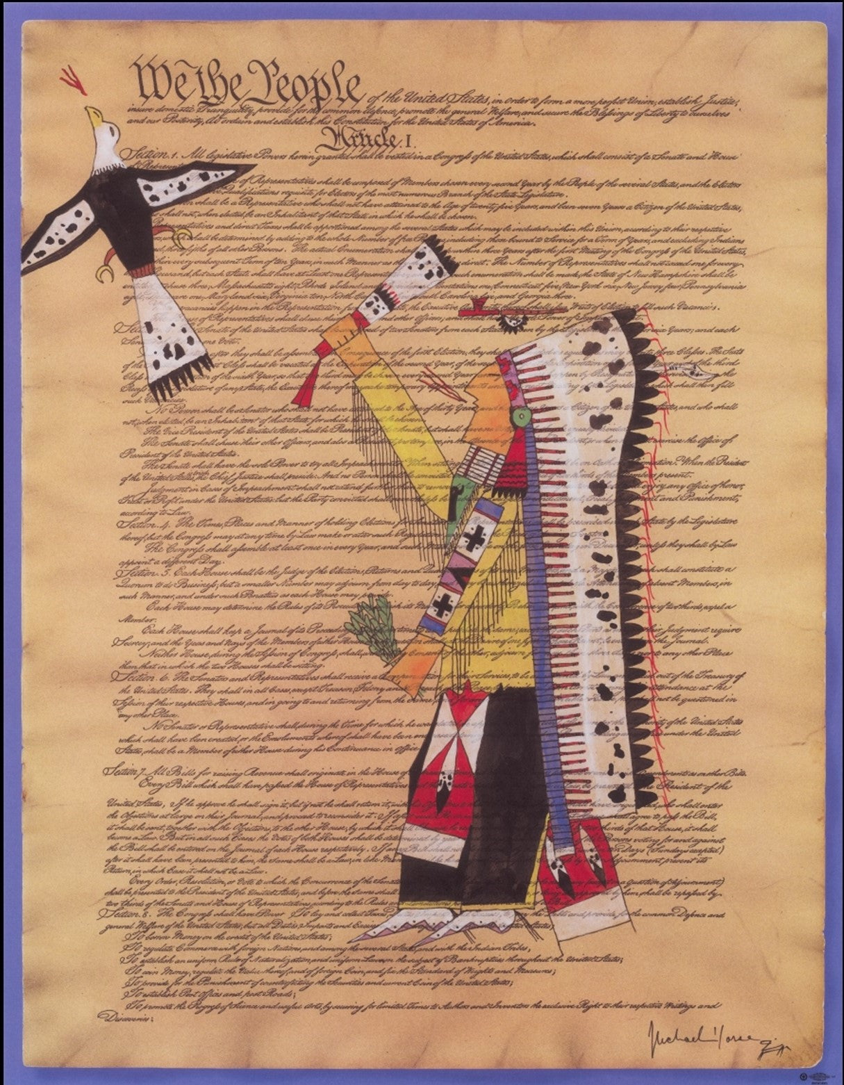 "We The People" is a ledger painting by award-winning Yaqui artist, Michael Horse. The original was painted on a copy of the Preamble to the Constitution.